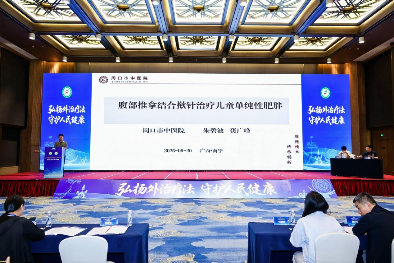 2025年9月19日至9月21日,2025年中国中医药学会外治分会在广西南宁召开,儿童单纯性肥胖作为体重管理领域亟待突破的重点与难点,成为本次会议的议题之一。周口市中医院康复中心主任龚广峰带领其团队成员副主任医师朱碧波参与论坛,并作题为《腹部推拿联合揿针治疗儿童单纯性肥胖》的学术汇报。