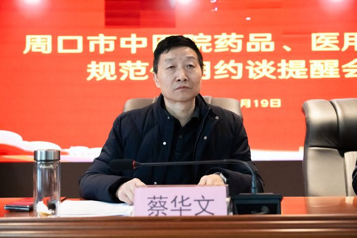 12月19日下午,周口市中医院召开药品、医用耗材规范使用专题约谈提醒会,党委委员、纪委书记蔡华文作专题讲话,各相关科室主任、护士长参会,会议由党委委员、副院长王俊峰主持。