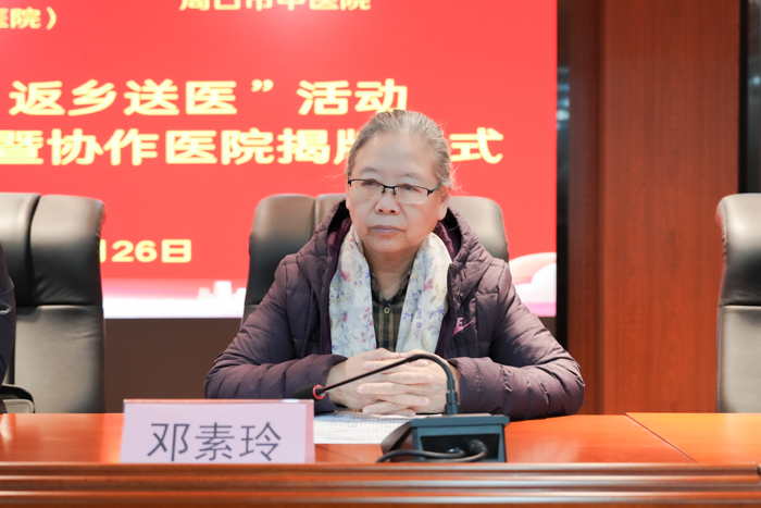 仪式现场氛围热烈,首先,周口市中医院党委副书记、院长毛国璋致辞。他表示,返乡名家是周口的骄傲与中医药事业的宝贵财富,让乡亲们在家门口就能享受顶尖中医药诊疗服务;协作医院及邓素玲名老中医药专家传承工作室揭牌恰逢周口建设国家中医药传承创新发展试验区关键节点,为医院人才培养、学科建设、科研攻关搭建了更高平台。医院将以此次活动为契机,深耕传承、突破创新、提质服务,践行“承古纳新、仁和精诚”的院精神,不负重托与期盼,以协作共建成果惠及更多群众,共谱健康周口建设新篇章。