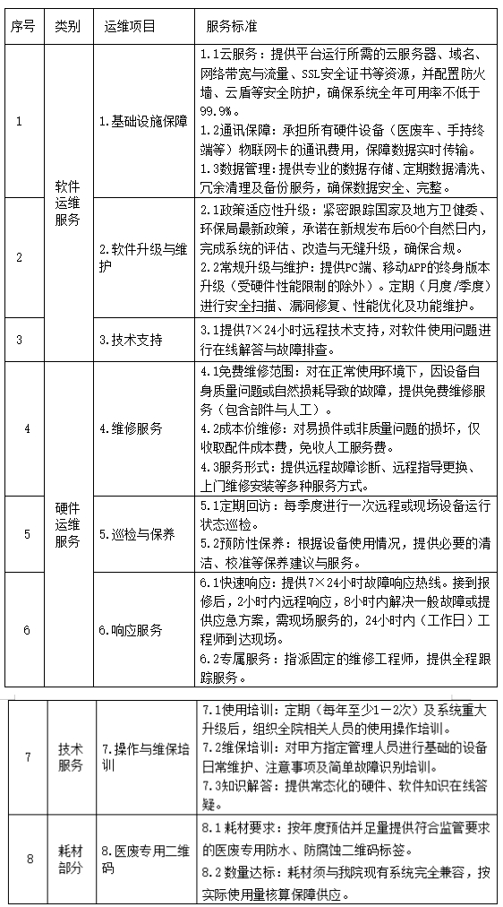 项目背景:我院于2023年部署实施了智能医废信息管理平台(含软件系统及配套硬件设备)。为保障该系统及其配套硬件(3辆智能医废车、1台出入库设备等)的持续正常使用,适应最新监管要求,拟采购为期三年的原厂标准化运维服务。