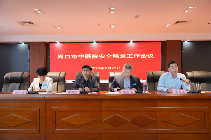 9月29日下午,周口市中医院2025年安全稳定工作会议在5号楼20楼会议室召开,专题部署“双节”期间医院重点工作,确保节日期间各项工作安全、有序开展。周口市中医院党委书记史卫东,党委副书记、院长毛国璋,党委委员、工会主席张红梅,党委委员、副院长王俊峰出席会议。史卫东书记主持会议。