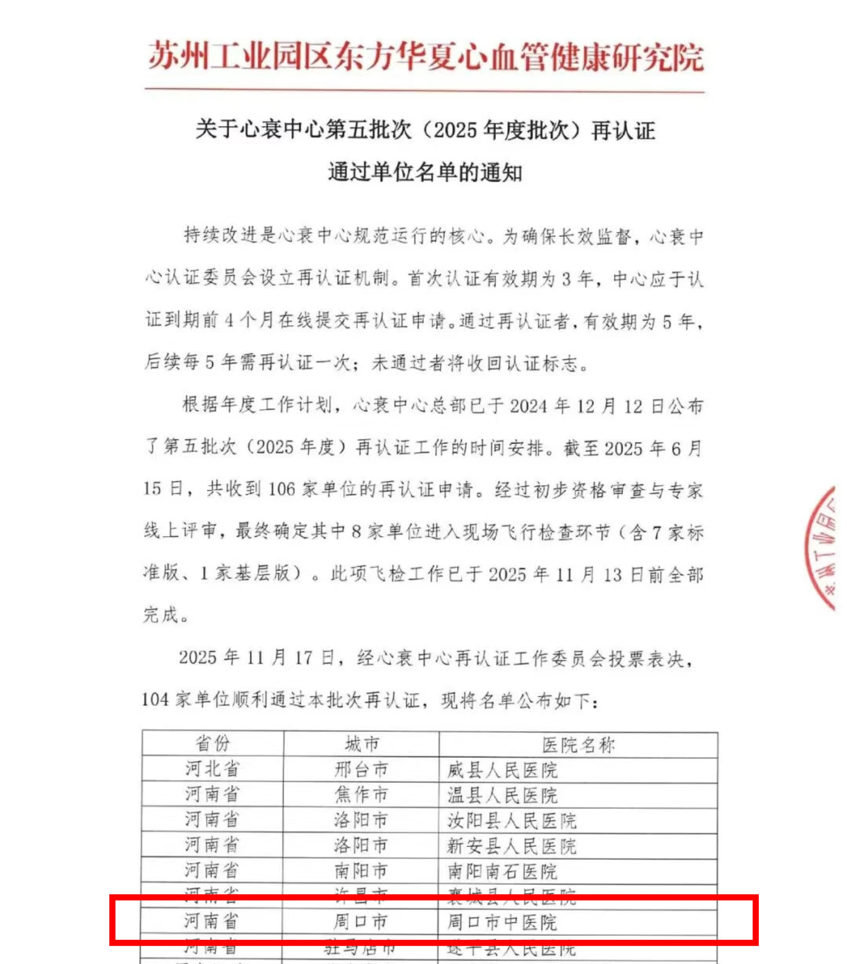 近日,周口市中医院心衰中心再传佳讯——该中心以优异成绩顺利通过国家级心衰中心再认证。这标志着我院在心衰疾病规范化诊疗、多学科协作与全程管理等方面的综合能力,再次获得国家权威机构高度认可,为区域心衰患者健康保障构筑了更坚实防线。