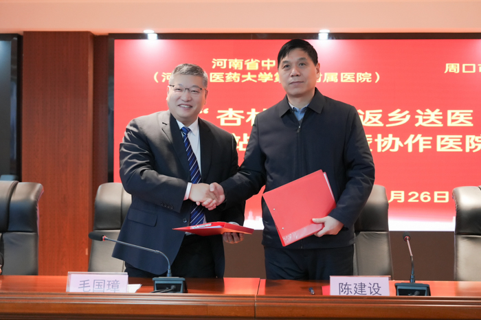河南省中医院副院长陈建设与周口市中医院院长毛国璋共同签署“医联体协作单位”协议、补充协议及“高水平专科”协议