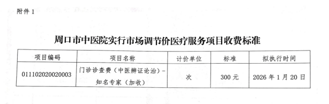 根据周口市医疗保障局、周口市人力资源和社会保障局《关于规范整合综合诊查类和超声检查类医疗服务价格项目的通知》(周医保办【2025】44号)文件精神,我院需开展实行市场调节价的医疗服务价格项目门诊诊查费(中医辨证论治)-知名专家(加收),现将收费标准进行公示。